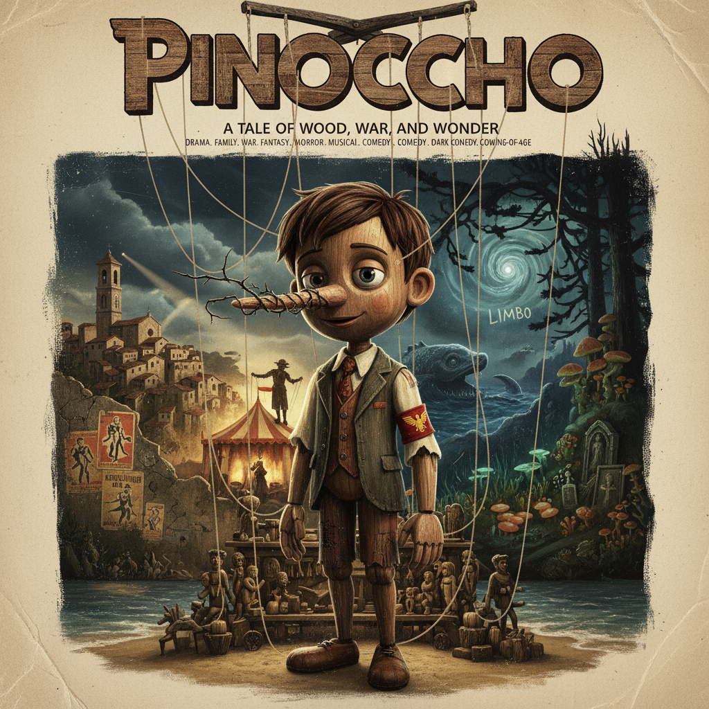 Overview: The story begins with Geppetto, an elderly woodcarver, mourning the loss of his son Carlo, who died in the Great War. In his grief, he creates a puppet named Pinocchio, wishing for it to come to life. Pinocchio awakens with childlike curiosity and a desire for acceptance, leading him on a journey filled with adventures and misadventures. As he navigates the complexities of life, he encounters various characters, including the manipulative Count Volpe, who seeks to exploit Pinocchio's uniqueness. The narrative explores themes of love, loss, and the quest for identity, culminating in Pinocchio's realization of the importance of sacrifice and connection. The story concludes with a poignant reunion between Pinocchio and Geppetto, emphasizing the transformative power of love.